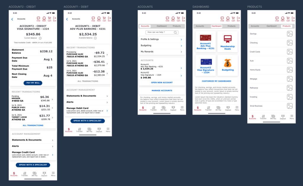 I translated the strategy into a high-fidelity prototype built in Figma, using peer collaboration and iterative feedback to validate usability and accessibility improvements. Starting with wireframes, I established a clear information hierarchy, refined task flows for simplicity, and conducted multiple feedback rounds to address clarity, onboarding flexibility, and navigation ease. Each iteration focused on improving flow logic, visual contrast, and cross-screen consistency to ensure a frictionless experience of the mobile banking.